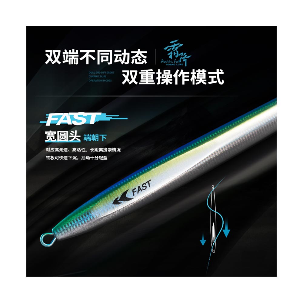 A comprehensive metal lure with original shape design. Two asymmetrical ends provide a speed and slow dynamics. 1:3 center of gravity and special shape make the jigging fishing more varied. Wide and round end down for high current speed, high activity and long distance search. The metal bait can sink quickly and jig lightly. Slow thin and sharp end down for slow current speed, low activity and aimed water search. The metal bait can move in multiple positions.