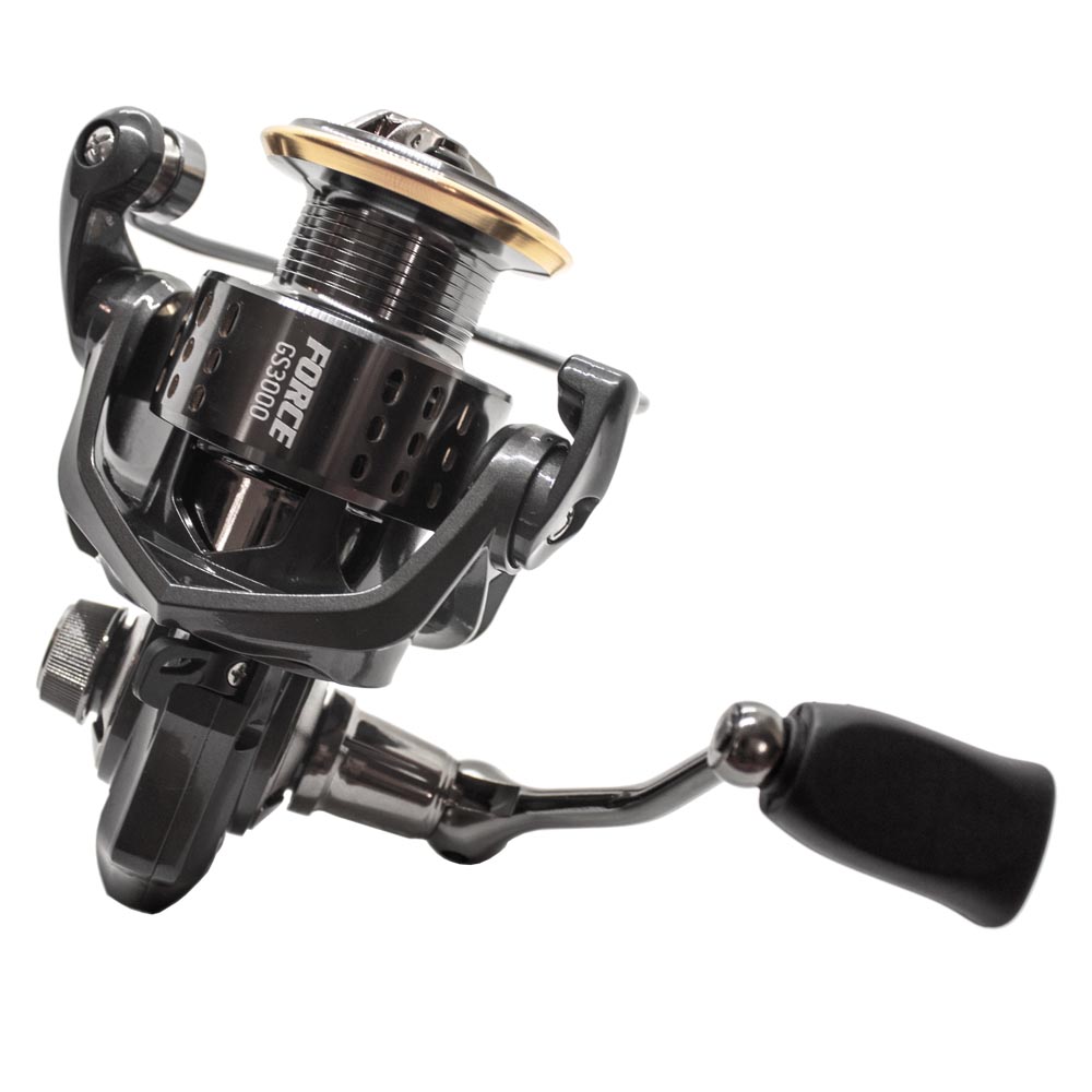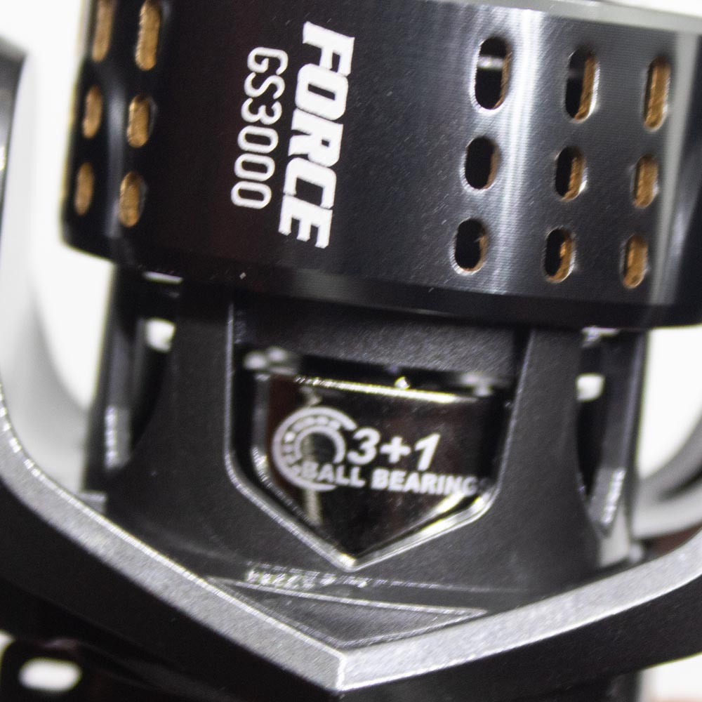 Το GS3000 μοιράζεται το ίδιο σώμα και τον ίδιο ρότορα με το μικρότερο «αδελφάκι» του αλλά διαθέτει μεγαλύτερη μπομπίνα και κατ’ επέκταση φρένα ώστε να μπορεί να χρησιμοποιηθεί στο spinning από όσους ζητούν έναν ελαφρύ μηχανισμό βάρους 228gr με απόδοση σε μεγάλα ψάρια και smooth λειτουργία, απίστευτα γραμμικά φρένα και τέλειο τύλιγμα. Διαθέτει κωνικού τύπου roller με ένα ρουλεμάν, άκαμπτο και δυνατό σύρμα στο bail arm και τέλος ένα πολύ σφιχτό και δυνατό ελατήριο κίνησης του bail που αντέχει κάτω από όλες τις καταπονήσεις των απότομων και βίαιων jerks. Η μεγάλη πεταλούδα των φρένων έχει μεγάλο και εργονομικό μοχλό ώστε να μπορούμε να αλλάζουμε εύκολα και γρήγορα την ρύθμιση τους ενώ τα ικανοποιητικά φρένα 5kg δύναμης, αποτελούνται από τρεις μεταλλικές και τρεις πάνινες ροδέλες με σωστή λίπανση. Η μπομπίνα είναι μεταλλική όπως και η μανιβέλα που καταλήγει σε μικρό μαλακό πλαστικό χερούλι τύπου Straight Shape. Το Force GS3000 είναι ίσως η πιο ποιοτική λύση της αγοράς σε αυτήν την τιμή απόκτησης για όσους θέλουν ένα μηχανισμό μικρό στο spinning αλλά με μεγάλες δυνατότητες!